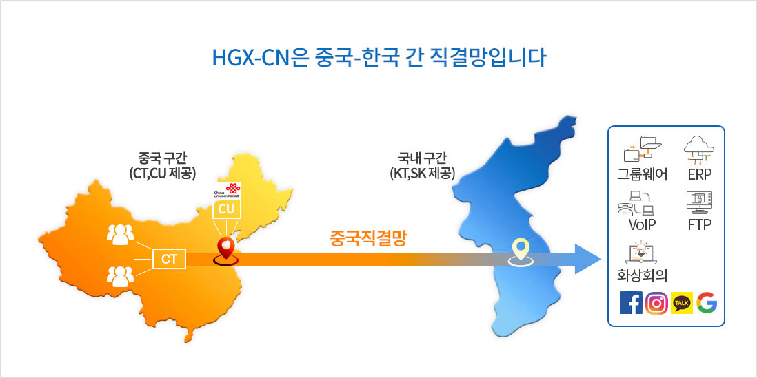 중국 주요 유선 사업자인 CT(China Telecom) / CU(China Unicom)를 통한 HGX 전용 회선 구성으로
